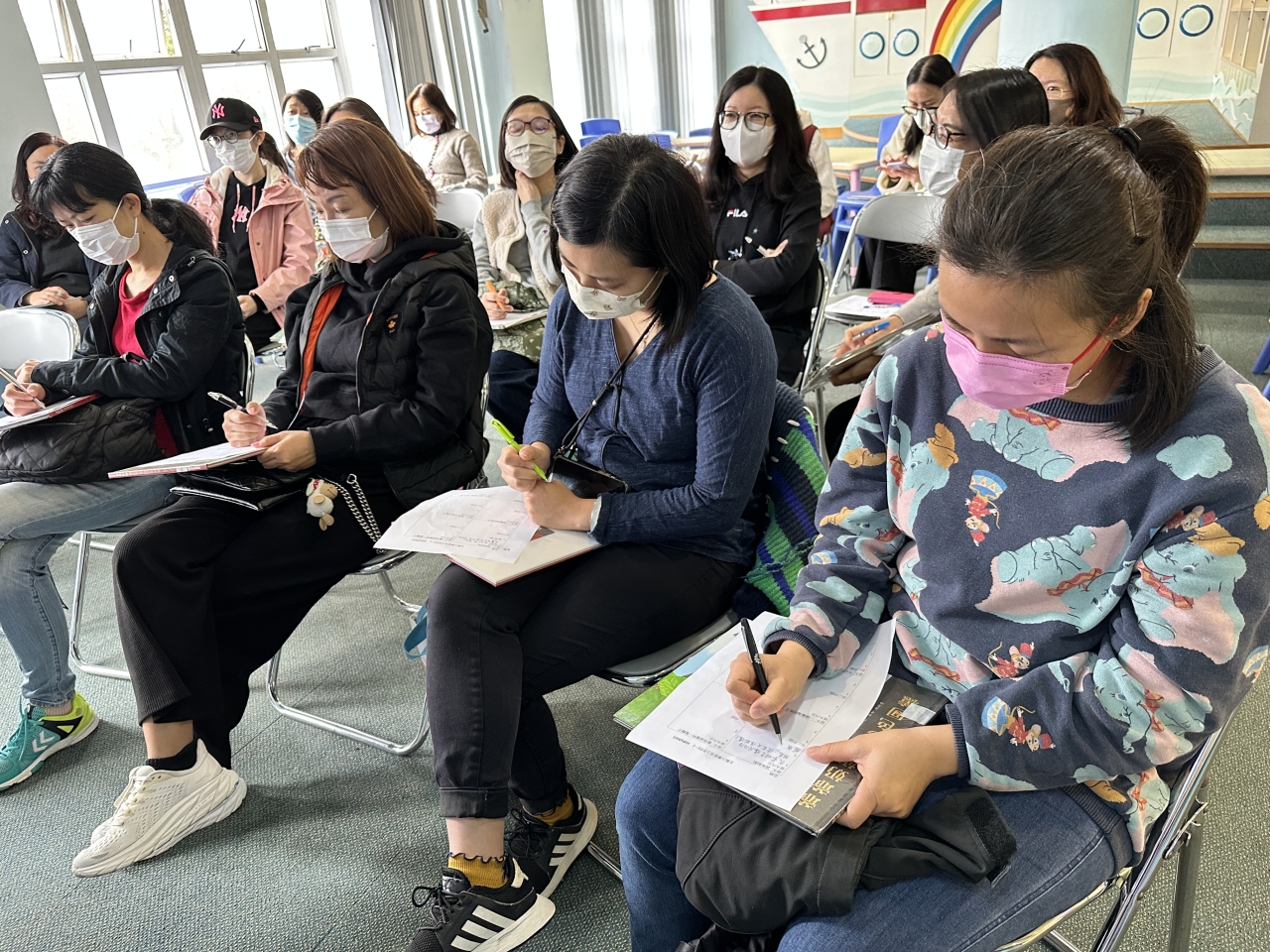 家長們都十分認真上課,並會摘錄筆記,記下親子閱讀的方法,務求將所學的內容都帶回家練習。